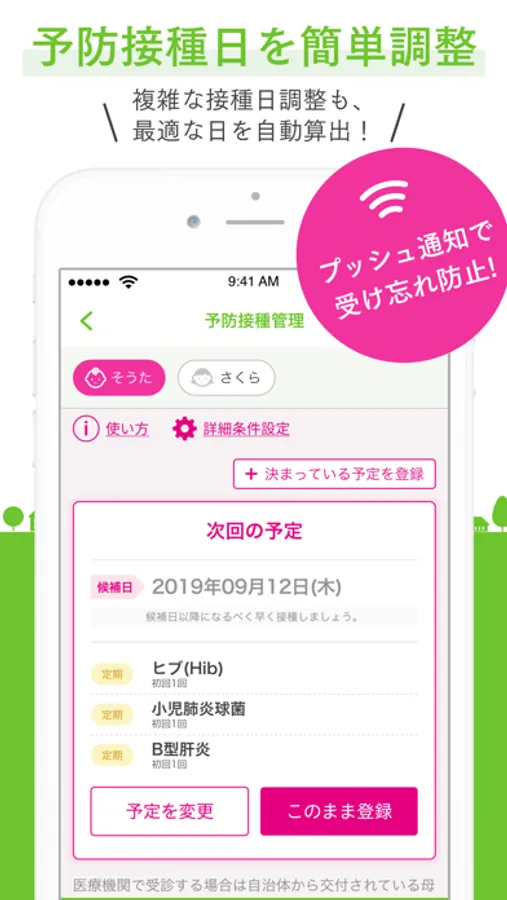 出生日と実際の接種日に応じて最適接種時期を自動で算出し、予定日が近づくと事前にお知らせします。