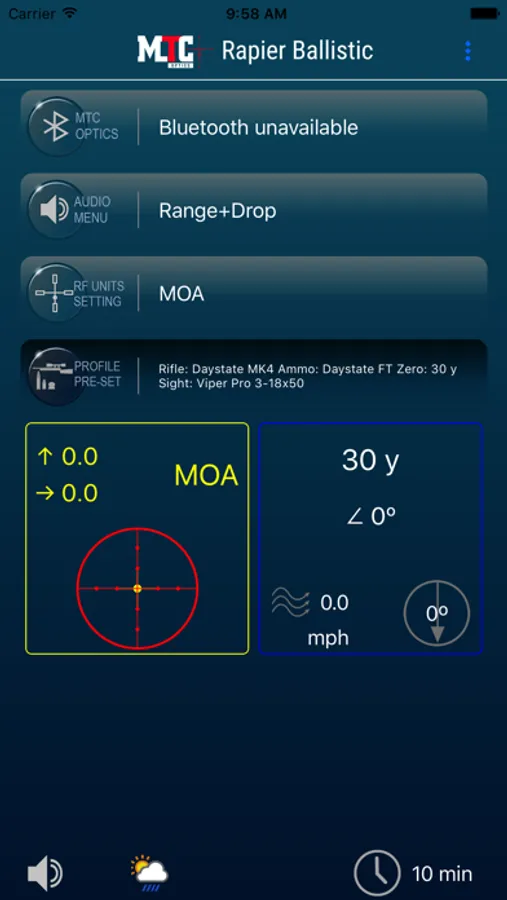 The MTC Optics Rapier Ballistic Calculator App connects to the MTC Optics Laser rangefinder. Enter data to give bullet drop in Mils, MOA, mm and inches. Can be programmed to take into account wind and will show fall of shot on the on-screen reticle.
