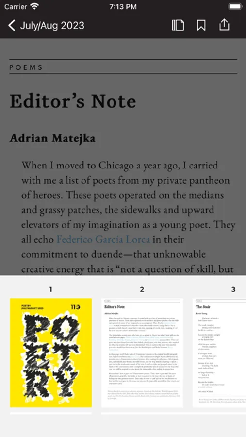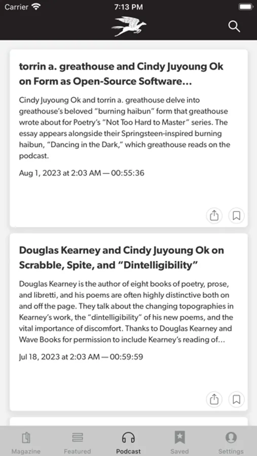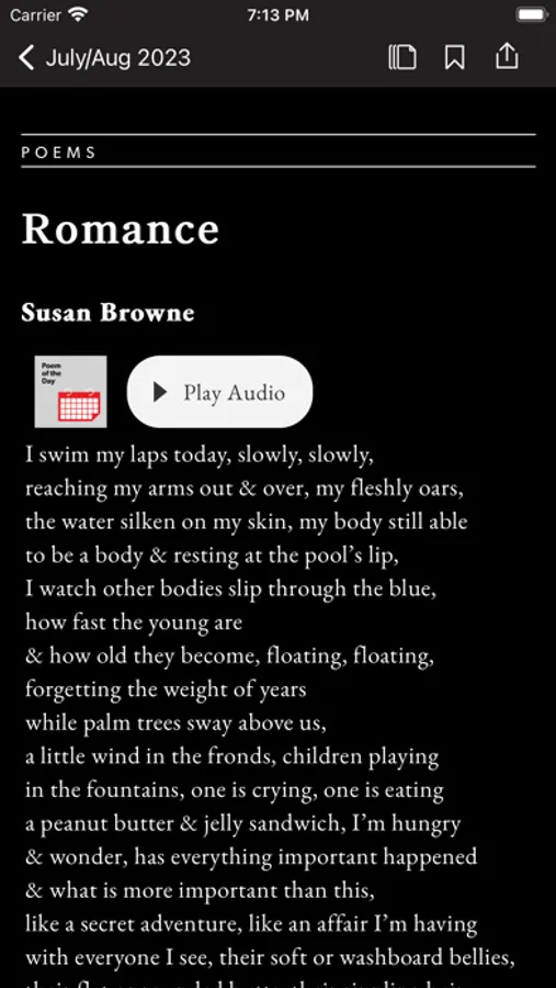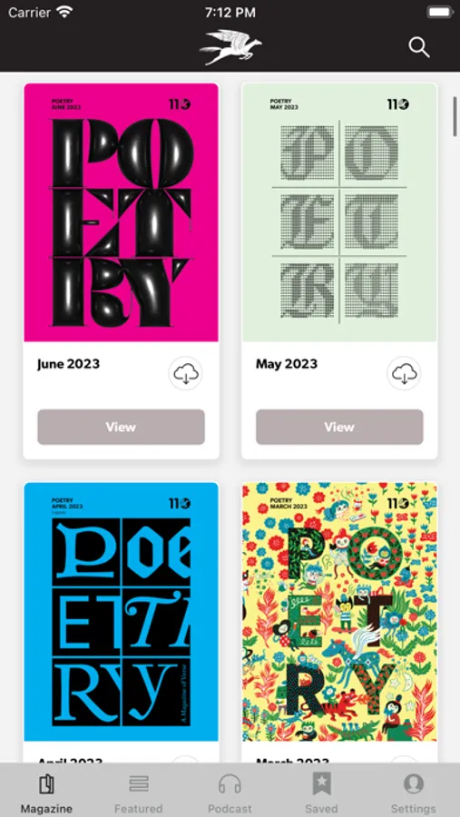 POETRY magazine has been a monthly gathering space for poets and readers for over a century. The POETRY Magazine app delivers all the poems, prose, and special portfolios found in the monthly print edition of POETRY, plus exclusive digital extras, such as podcasts, fresh looks at archival content, and contributor essays. It also allows you to save your favorite poems and prose in each issue.
