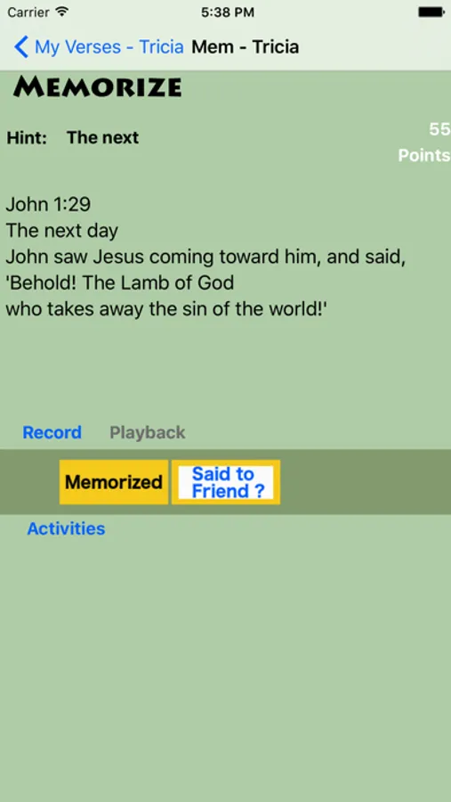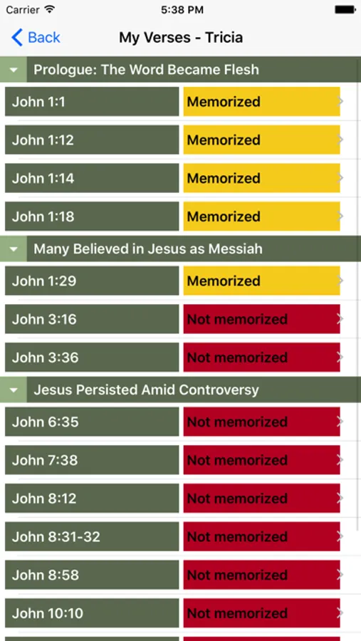 Here’s help for memorizing key verses in the Gospel of John. See, say and record the verses, and play several games to help you commit verses to memory. Tracks memory and review status for multiple participants and gives points for their memory/review activity. Shares memory status information across multiple devices via iCloud.
