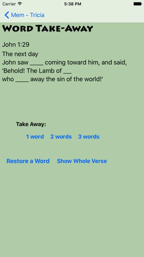 - Memory games such as Phrases (show a phrase at a time), Word Take-Away, and Reference ID (gives the Scripture text and lets you choose the reference)