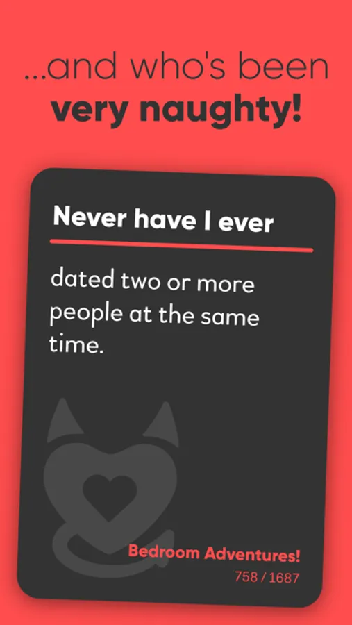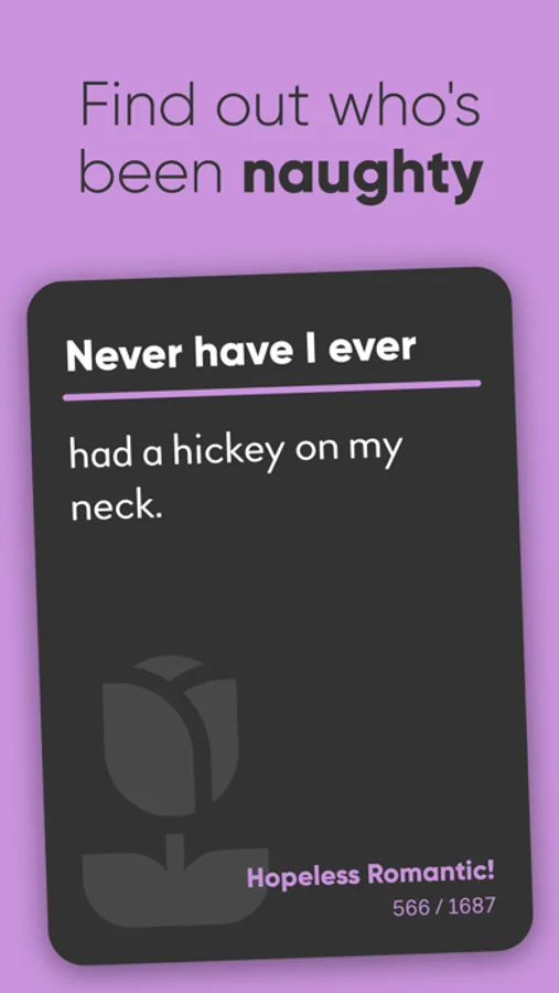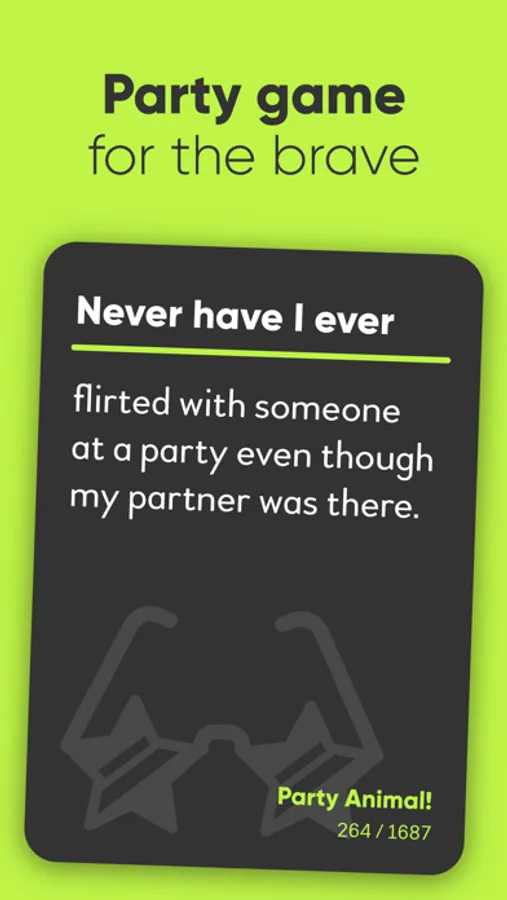 Never Have I Ever: Dirty is a group game that will help you start a crazy house party wherever you go. You can play it with your closest friends, or complete strangers. It will be the ice breaker you need every time.