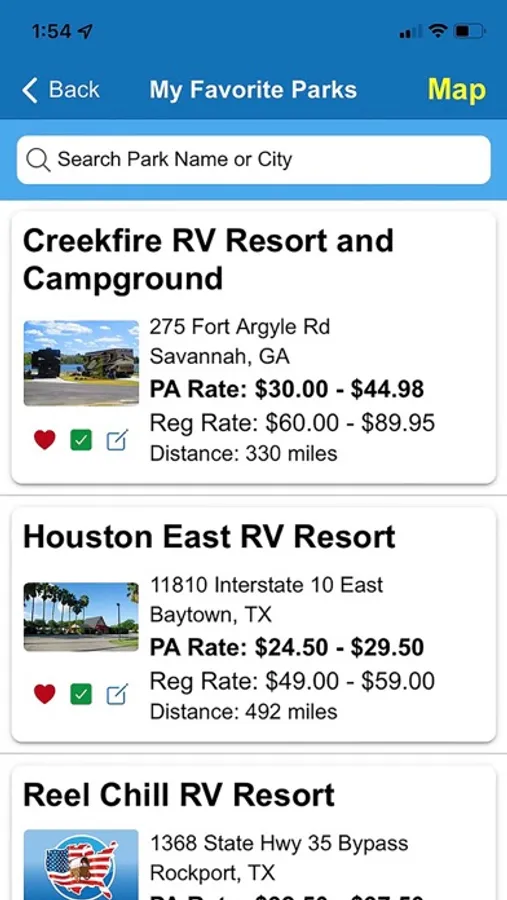 - Mark your Favorite or Visited Campgrounds, and see those on a map as color-coded pins.