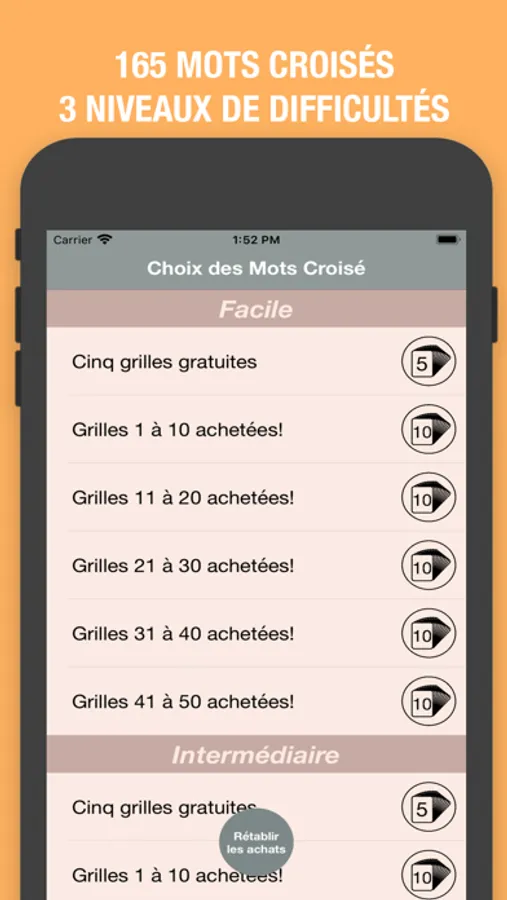 - Cinq mots croisés gratuits par niveau pour un total de quinze