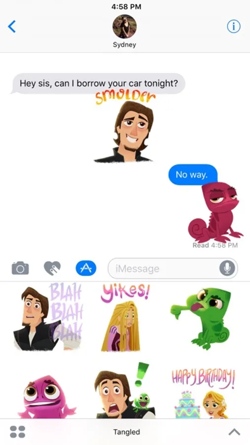 Express yourself in new ways with dynamic and animated Disney Stickers you can put anywhere in your chat. Scale, rotate, and layer stickers—even place them on photos you send and receive! Discover all our sticker packs in the iMessage App Store including Disney's The Lion King, Pixar's Finding Dory, and more. Use Disney Stickers to add magic to your iMessages!