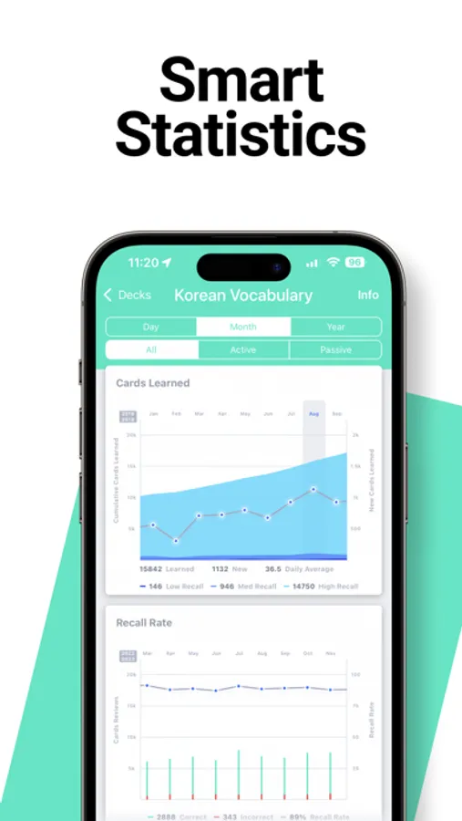 Monitor your learning journey with beautiful charts and statistics, tracking overall recall rate, total cards learned, upcoming review schedules, and more.