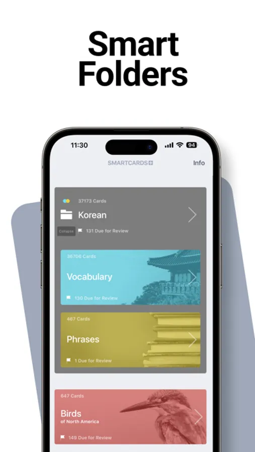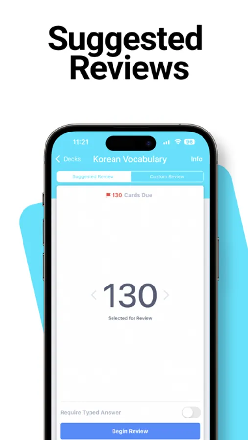 Our sophisticated algorithm suggests daily reviews based on your performance and learning needs. SmartCards+ predicts when you're likely to forget a card and shows it to you before that happens. By leveraging spaced repetition, cards you know well are shown less frequently, while difficult cards are reviewed more often. Perfect for test preparation, language learning, mastering complex concepts, and much more!