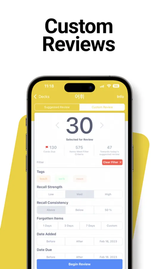 Tailor your learning experience with custom reviews based on tags, performance, recall strength, and other criteria.