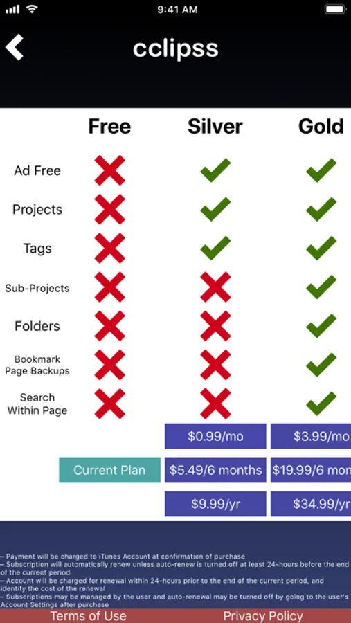 Upgrade to the Silver Plan for just $0.99/mo, $5.49/6 months, or $9.99/yr to get an ad free experience along with the ability to organize your bookmarks by projects and tags to find the content you are looking for quickly and easily. You can subscribe to the Silver Plan within the app by choosing "Upgrade" from within the application settings menu. The Silver Plan auto-renews every month, every 6 months, or every year, depending on which plan you select.