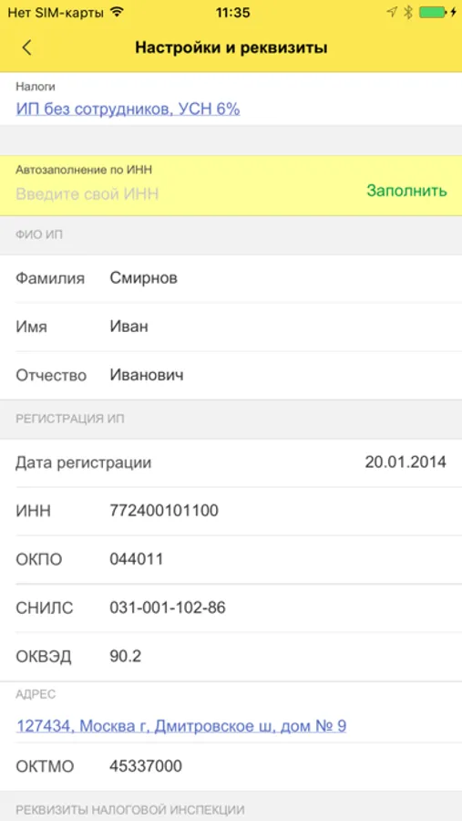 • Ввод адреса по классификатору, тому же, что использует налоговая