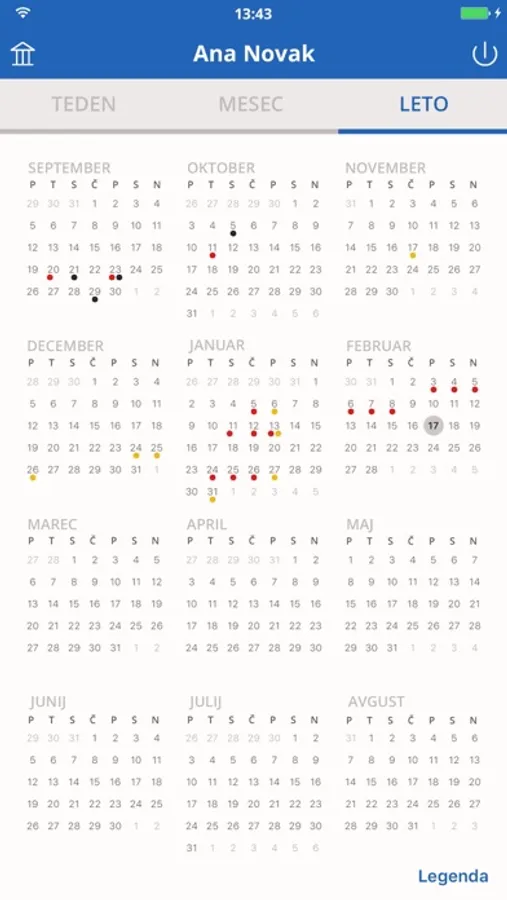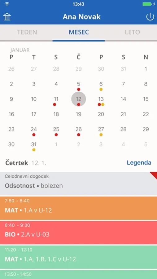 KOLEDAR: Pregled učnih ur in dogodkov na tedenski, mesečni in letni ravni.