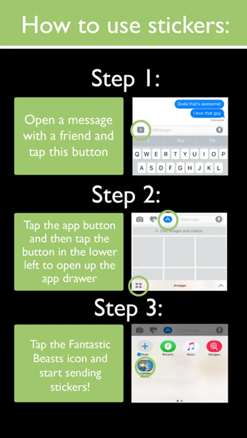 Step 3: Tap the the button that looks like four ovals in the lower left of your screen to open the iMessage app drawer. Any sticker packs you installed will show in your app drawer. Tap an icon to start sending your stickers!