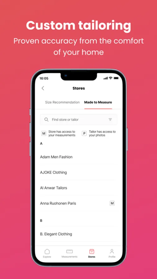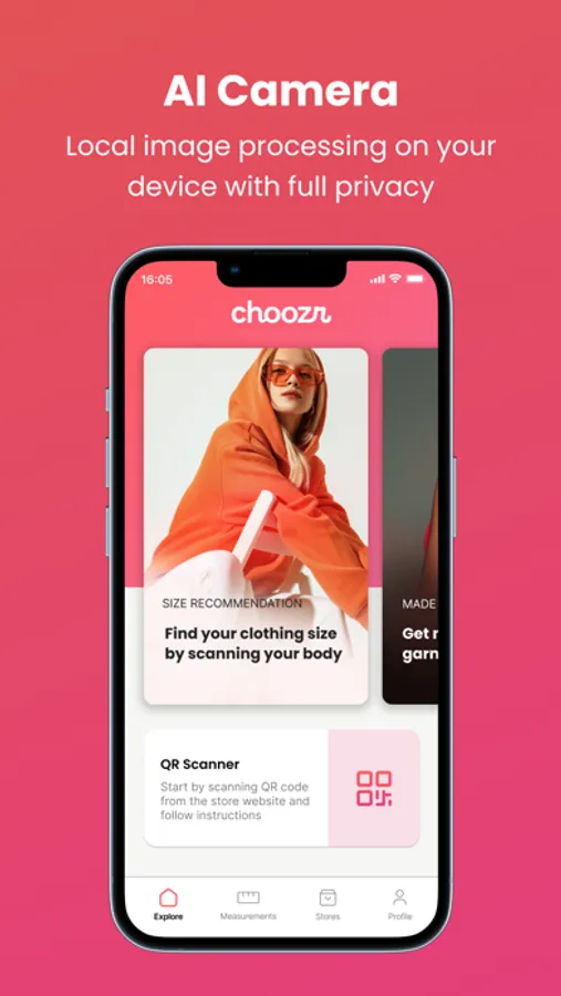 After measuring yourself through an easy and intuitive process, you can access precise size recommendations in online stores connected with Choozr or share your measurements with your trusted tailor.