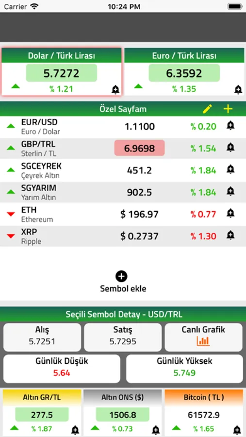 DövizFX ile Dolar / TL , Euro / TL ve Altın,Gümüş Fiyatlarını anlık olarak izleyebilir, bunun haricinde size özel sayfanıza 180'den fazla dünya paritesini ekleyerek sadece takip etmek istediğiniz sembolleri rahat bir şekilde anlık güncellemeler ile izleyebilirsiniz. Ayrıca 2500+ kripto para sembolünü yine anlık güncellemeler ile ve tüm altın fiyatlarını canlı olarak takip edebilirsiniz. Anlık grafikler ile de tüm bu sembolleri candlestick grafikler ile izleyebilirsiniz.