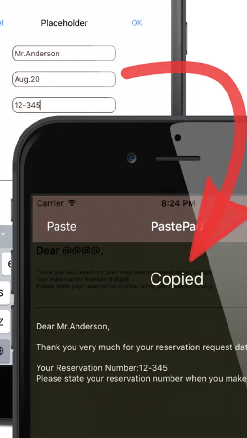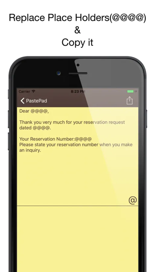Template string is also useful. You can include place holder "@@@@" string in your note. and set it when you copy or share this. for example, "Hello Mr.@@@@,How are you?" → "Hello Mr.Tanaka,How are you?".