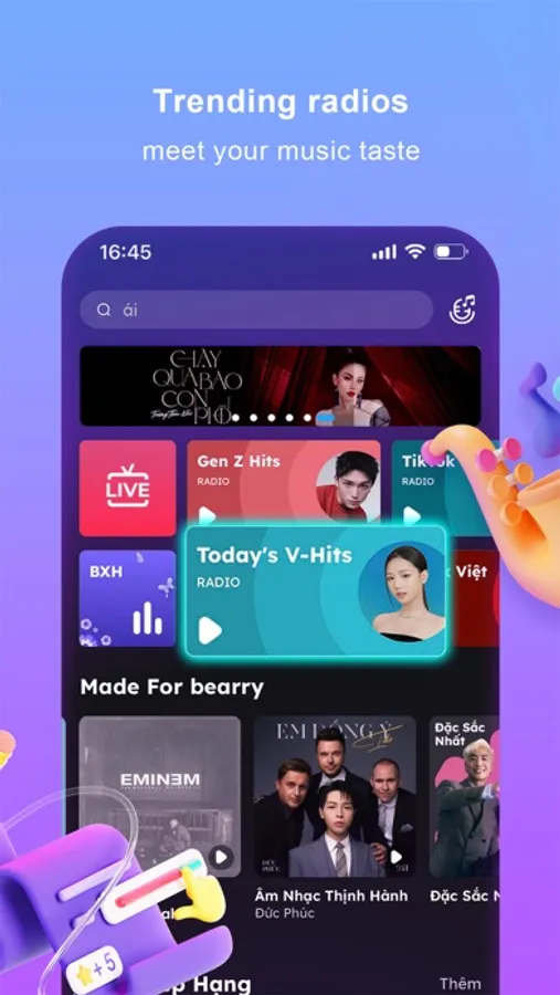 1. Easily search and listen to your favorite songs, artists, and playlists, including V-Pop, US-UK, and K-Pop.