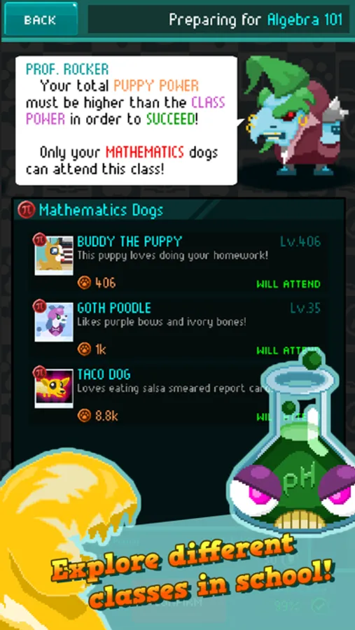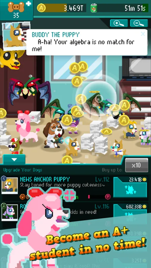 Tap on your homework to earn A’s. Once you earn enough A’s, you can adopt new pet dogs that does your homework for you. Use A's to purchase upgrades and level them up. Once you have enough A's, you can buy and upgrade dog toys and add decoration to your bedroom. Unlock new rooms to make new dog breeds available to you. And if you're feeling really brave, you can explore the school grounds, and send your pet dogs to attend dangerous classes that belong to Mathematics, Science, Literature, Arts and Sports!