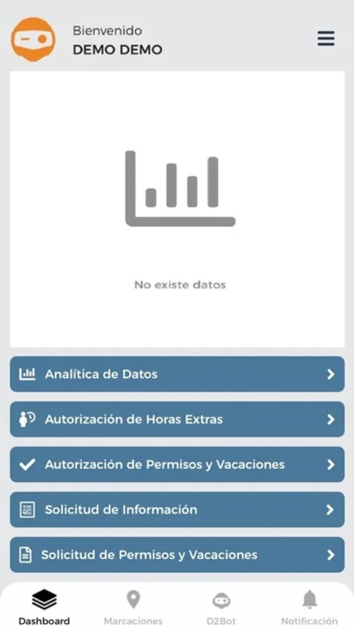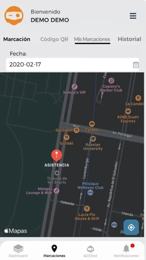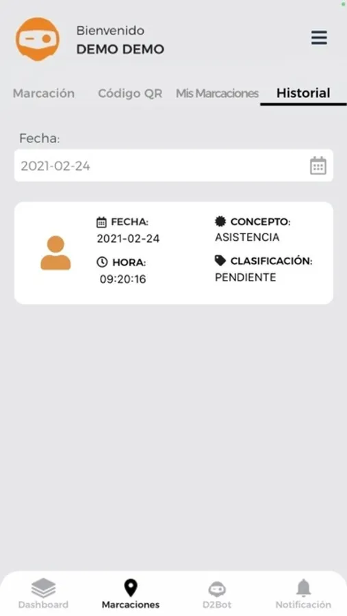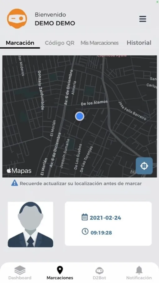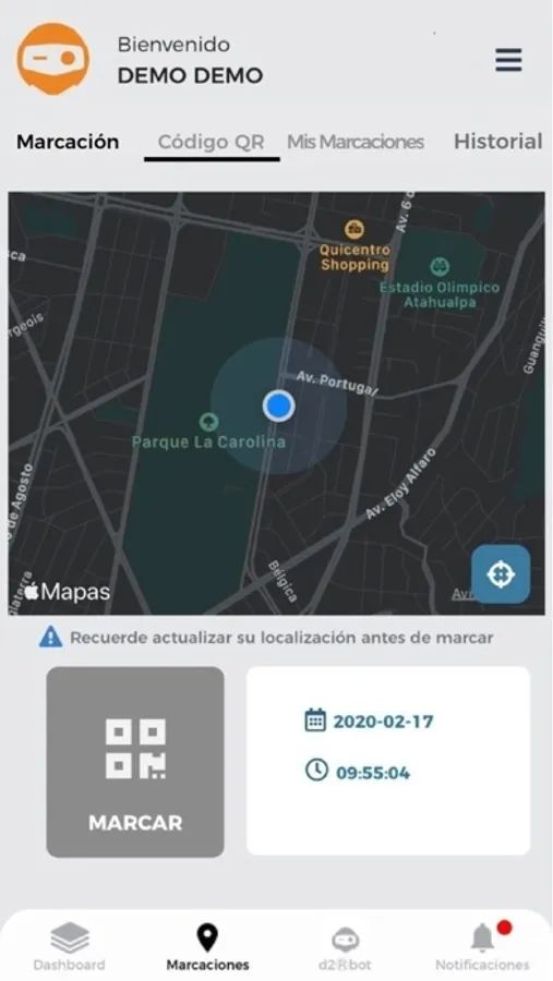 Aplicación de la empresa BIOMETRIKA S.A para realizar marcaciones remotas por toma de fotografía o lectura de códigos QR, recibir notificaciones de permisos y utilización de servicios del sistema d2Web.