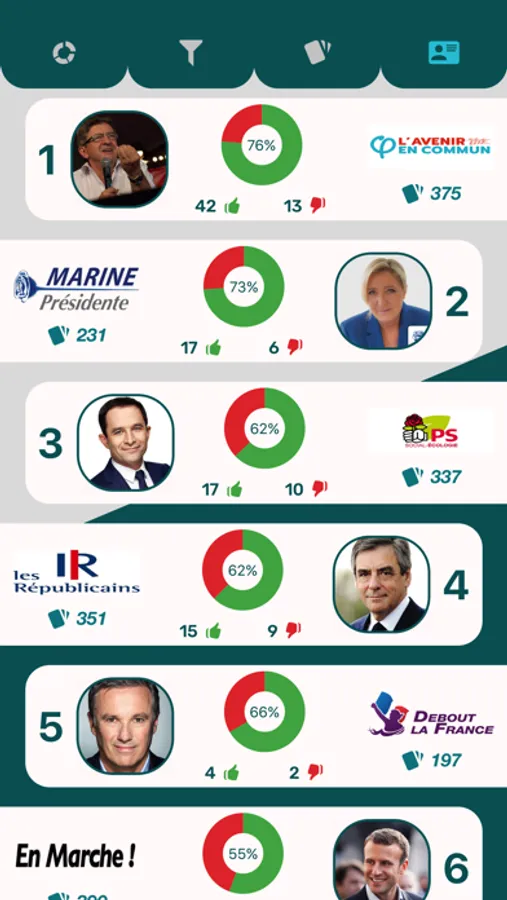 L'application permet de swiper entre différentes cartes contenant des divers information concernant le programme de vos candidats préférés.