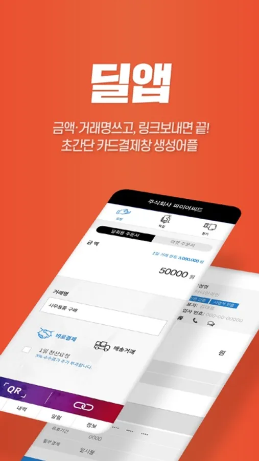 딜앱은 누구나 손쉽게 앱으로 카드결제창을 생성하여 카드결제를 받을 수 있는 결제 서비스입니다.