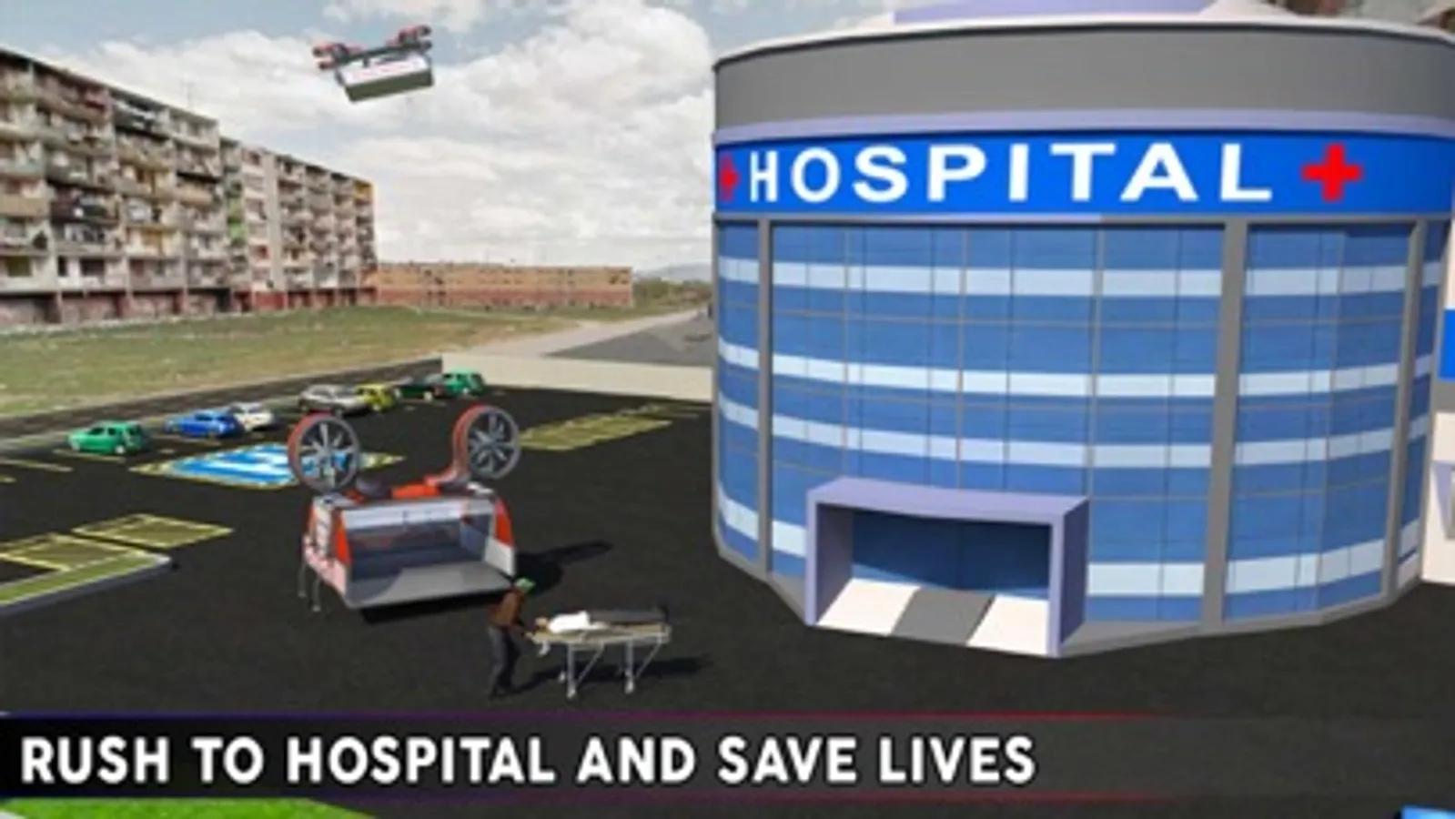This futuristic ambulance drone concept is incredible in emergency situations like city traffic jam where ambulances cannot reach accident spot on time. 911 rescue department dispatches emergency calls to nearest hospital rescuers to save citizens. Become ambulance helicopter pilot to takeoff from hospital rooftop and fly above traffic rush through curvy city buildings. Turn on flying ambulance sirens and enjoy timeless helicopter rescue missions in massive environment. Ambulance rescue driver job is very critical and dangerous so be careful and prepared to show courage, agility and alertness. Injured citizens need medical attention in abandoned town, take off in flying drone ambulance and transport patients to city hospitals. Stay alert & use reckless driving skills from ground to enjoy unique drone simulator game and reach accident site ASAP!