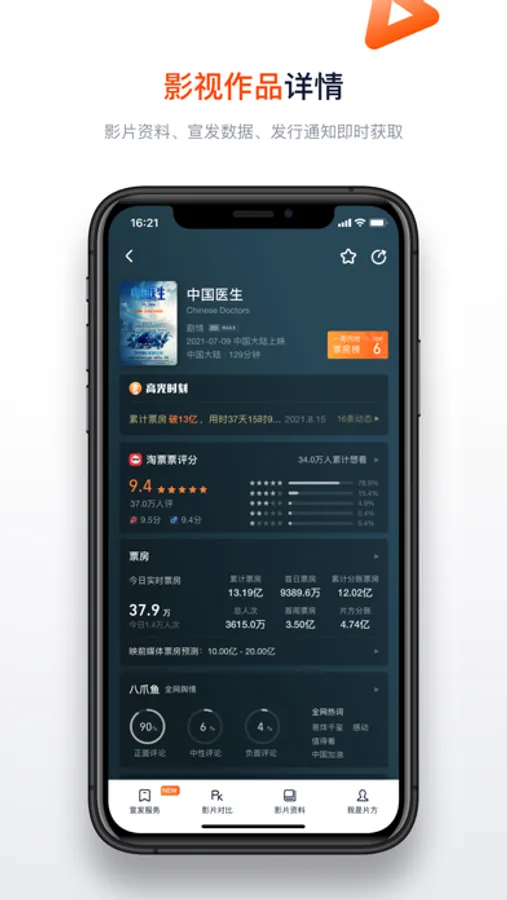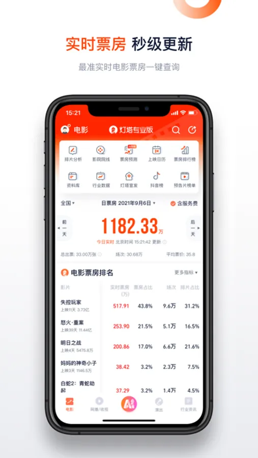 1、秒级实时票房:掌握大盘/影片票房,支持按档期和地区查询电影票房等指标;