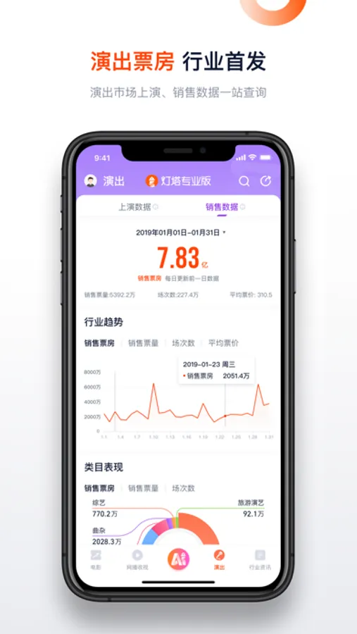 3、演出票房数据:首家公开演出行业票房,支持查看各演出类型票房数据、单个演出项目售卖数据;