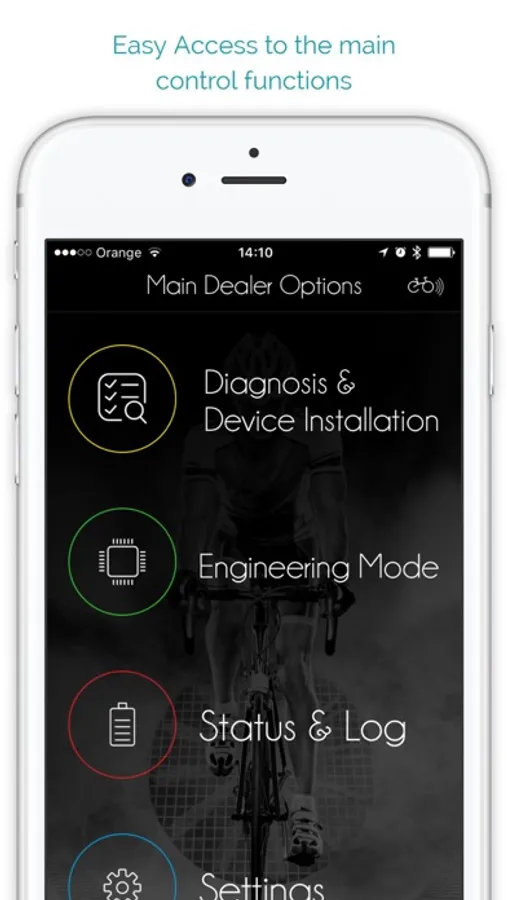 DEALER APP is an ebikemotion® smartphone application designed especially for stores and suppliers of electric bicycles. It is compatible with products designed by ebikemotion® and other electric bicycle technologies. The function of this application is to connect the eBike to the user´s mobile phone and the technical service, in order to directly carry out procedures such as diagnosis, reparation, set-up and updating or the replacement of components in case of a malfunction.