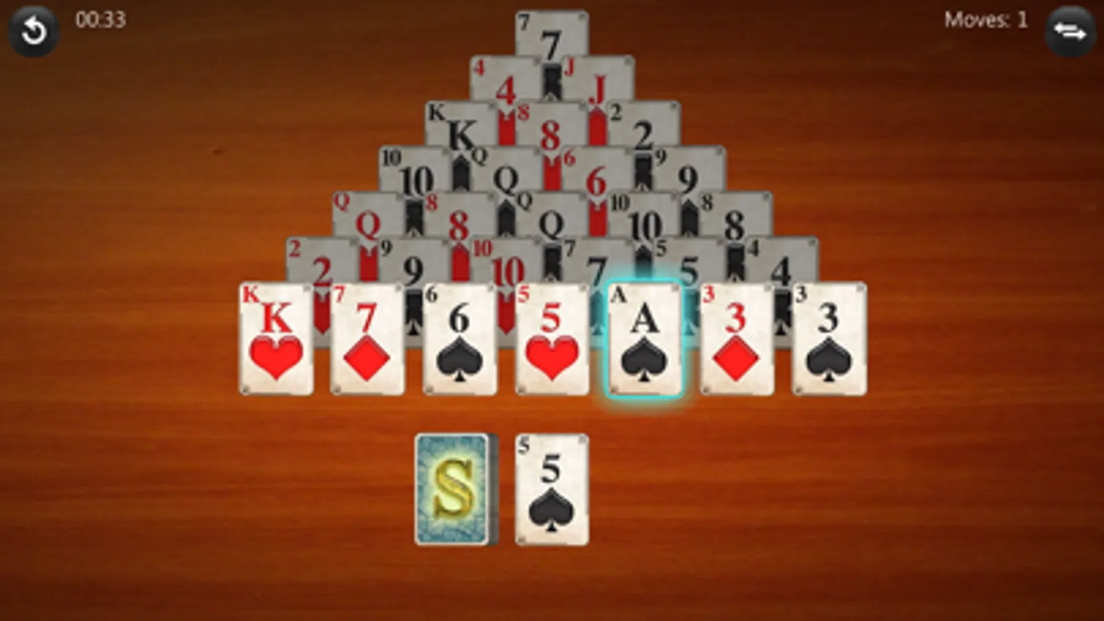 The game counts the moves you make, and measures the time it takes to finish the game, so you can compete against your previous best games. The best possible game would be if you never used the stock and always removed two cards at a time from the Pyramid (no kings), in that case your move count would be 14.