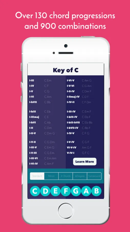 Over 130 chord progressions available in seven keys. This makes a total of ... over 900 different chord progressions!!! There is no song on earth that has not been composed with one of the progressions available in this app.