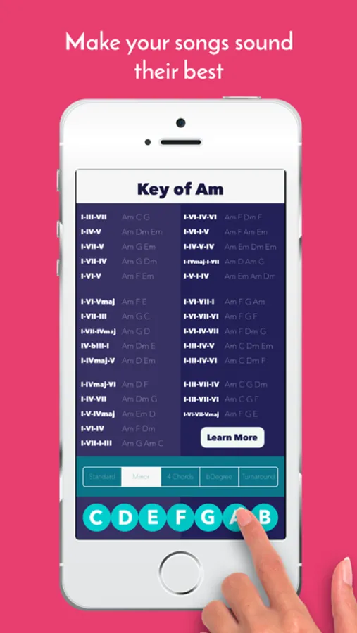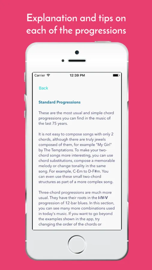 Choose the key you want to use, C, A, E ... whatever. Then choose a type of chord progression. The app will show you a lot of chord progressions that sound incredibly well. You can play with your instrument the progressions as they appear on the screen or use them as inspiration for your own composition. You also have a help page with tips to get the most out of the app.