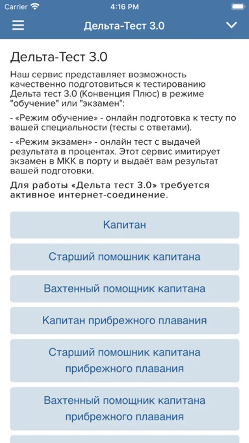 - в режиме экзамена прохождение теста на время (имитация экзамена в МКК в порту) или без ограничения по времени