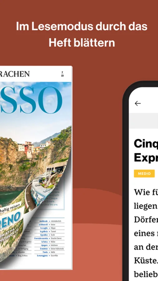 Das eMagazine bietet mit Interviews, Kolumnen und Reportagen spannende und aktuelle Einblicke in die italienische Sprache und Kultur. Jedes eMagazine beinhaltet 70 Seiten Einblicke in die italienische Lebensart und passende Übungen auf drei Niveaustufen: leicht (A2) – mittel (B1-B2) – schwer (C1-C2). Die Inhalte sind didaktisch speziell auf deutschsprachige Lernerinnen und Lerner abgestimmt. Mit einem einfachen Klick hören Sie passende Audio-Inhalte direkt zum Text.