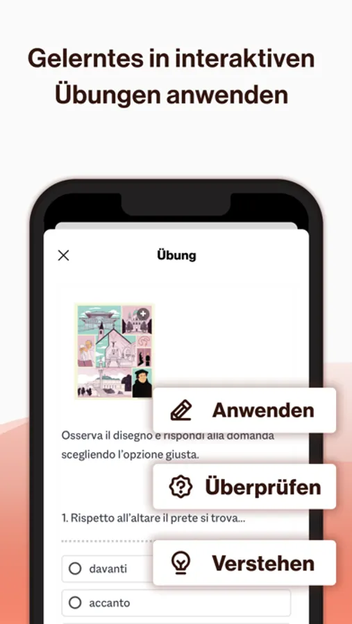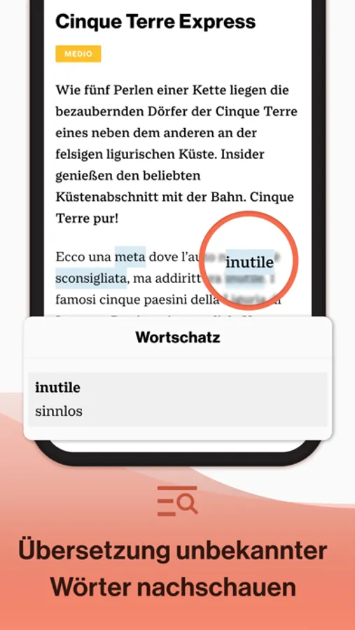 Die Adesso-App unterstützt Sie beim Italienisch lernen und bietet Ihnen eine intuitive Benutzerführung in der Verbindung von Text, Audioinhalten und Übungen. Durch das Anpassen der Schriftgröße ist gute Lesbarkeit auch auf kleinen Bildschirmen gegeben. Das Nachschlagen von unbekannten Worten direkt im Text ermöglicht Ihnen ein gutes Leseverständnis trotz unbekanntem Vokabular.