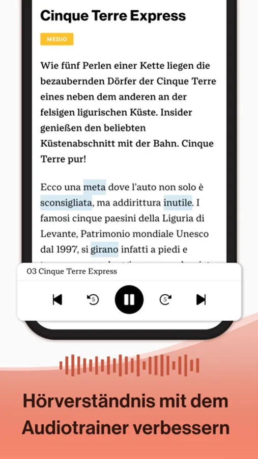 Entdecken Sie 60 Minuten Hörtraining pro Monat. Lernen, üben und hören Sie Italienisch, während Sie etwas anderes machen: im Auto, unterwegs, beim Kochen oder beim Sport. Hören Sie professionellen Sprecherinnen und Sprechern zu und verbessern Sie Ihren Wortschatz. Gleichzeitig trainieren Sie Ihre Aussprache.
