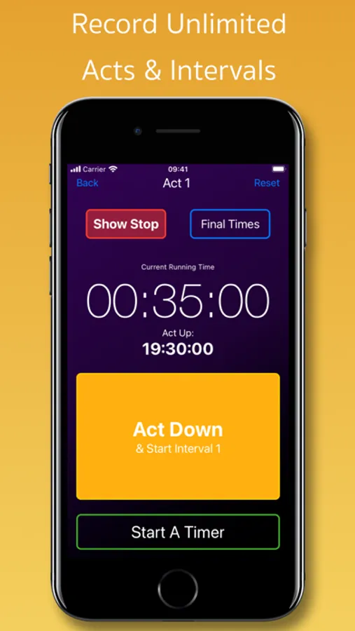 One evening, after a very long week of shows we were sat in the office looking at the show times wishing the running times would work them selves out (we've all been there), it was at this moment this show timing app was created. Welcome to the future of show timing without multiple stop watches and reminder alarms. Now you can start your show with the press of one button and the app does the rest. With unlimited Acts and Intervals in any configuration that you like! , just set your show structure, tell it your interval duration(s) and away you go.