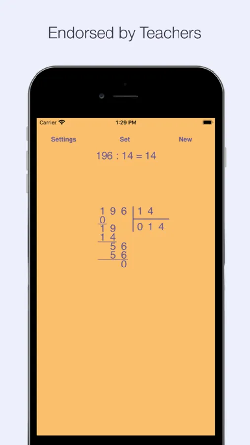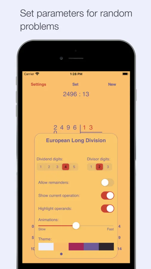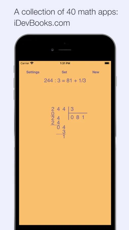 The European Long Division app can be used to teach and study the long division method that is used in several European countries. The user can solve custom and random division problems with small and large numbers.