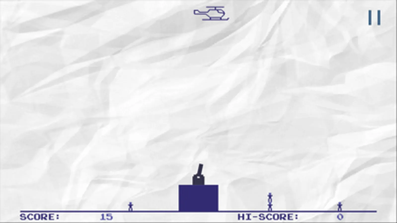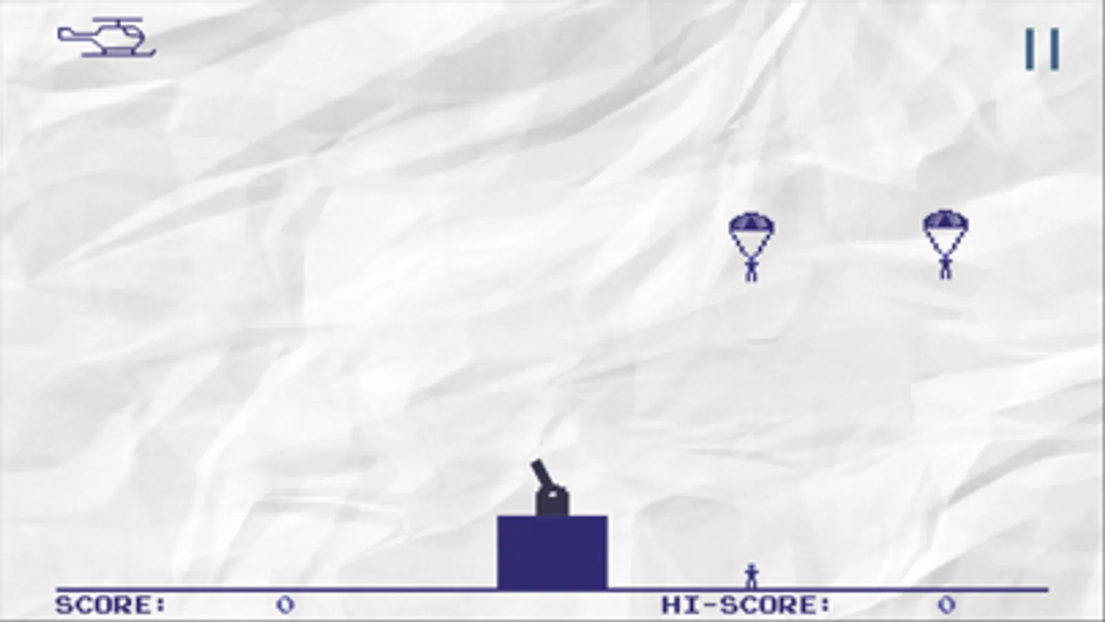 Helicopters fly across the screen at varying heights, dropping paratroopers. The gun may fire multiple shots at once, and the shots may destroy helicopters or shoot paratroopers.