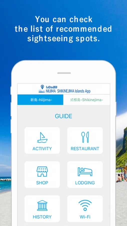 A list of sightseeing spots, restaurants, stores, etc. on Niijima and Shikinejima, respectively. The map displays information on each spot, and GPS can be used for route guidance. (Genres: Activities, Dining, Shops, Lodging, History, Wi-Fi, ATMs, Restrooms)