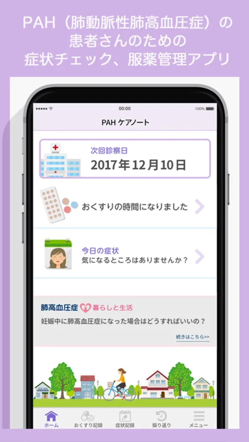 「PAHケアノート」は、PAH(肺動脈性肺高血圧症)の患者さんのため症状チェック、服薬管理、レポート共有アプリです。