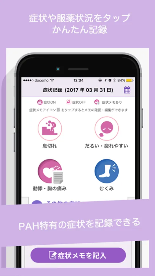 息切れやだるい・疲れやすい、動悸・胸の痛み、むくみなどPAH(肺動脈性肺高血圧症)に関連する症状をかんたんに記録できます。