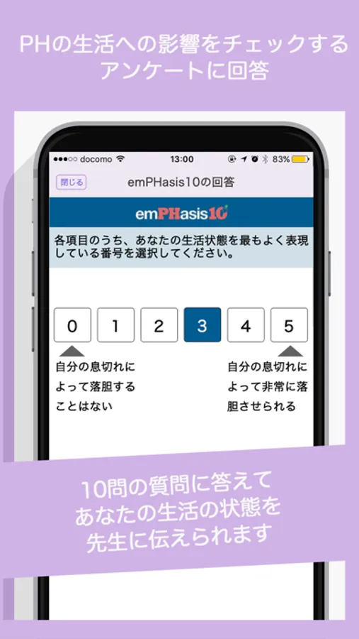 ・emPhasis10は肺高血圧症が生活にどれくらいの影響を与えているか確認するために作成された質問です。生活状態についての質問(10問)に定期的に回答して、診察時に先生と一緒に確認してみましょう。