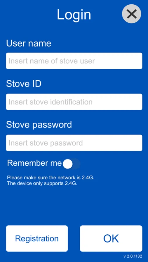 To use this app, login to selected stove is mandatory. At first usage new stove has to be registered: stove registration has to be performed once and for all.
