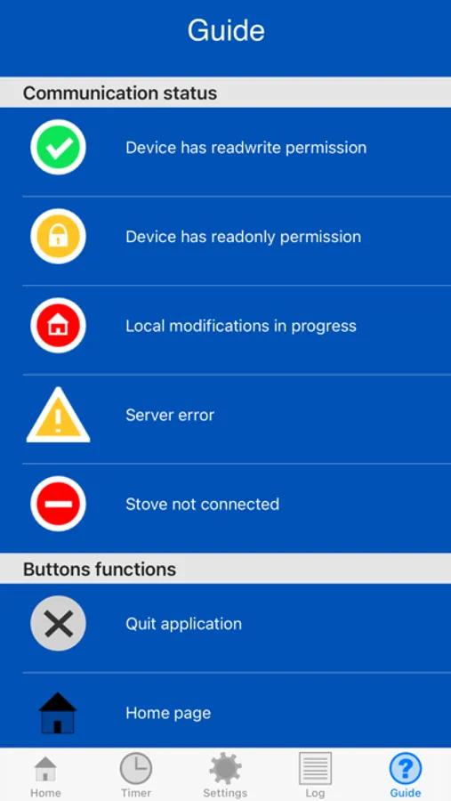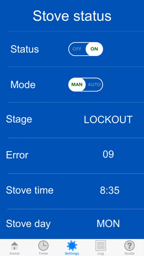 This app allows remote controlling of a pellet stove. It is possible displaying current stove state: room temperature, operating state, anomalies, operation set point and power settings, timer and operation mode.