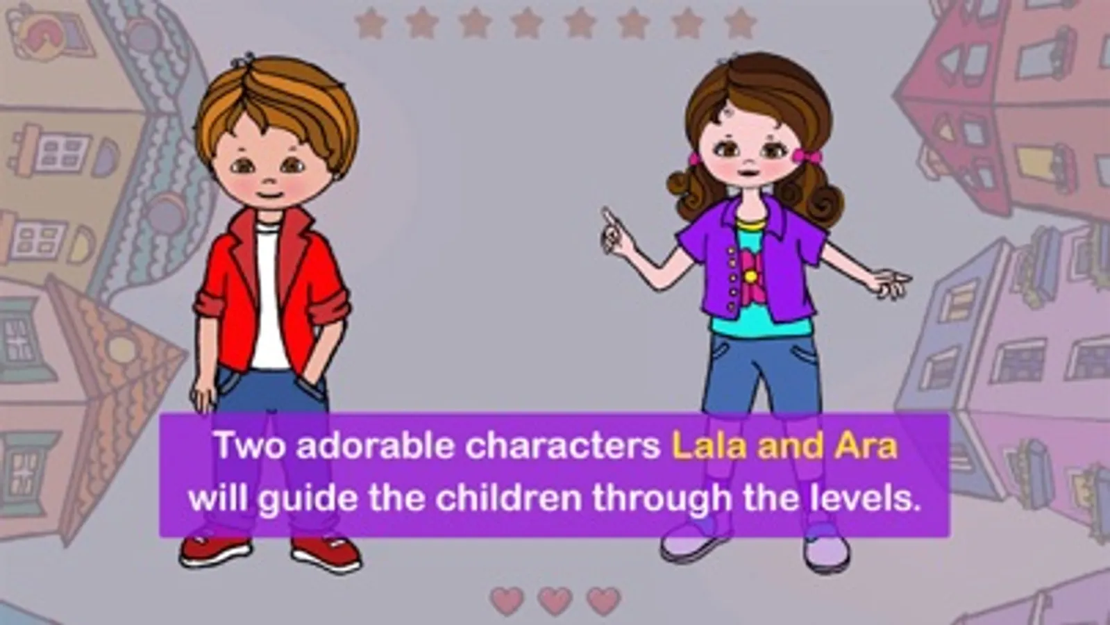 -Two adorable characters Lala and Ara will guide the children through the levels.