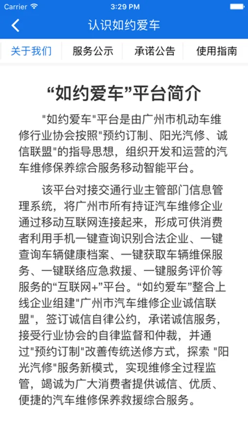 “如约爱车”平台是由广州市机动车维修行业协会按照“预约订制、阳光汽修、诚信联盟”的指导思想,组织开发和运营的汽车维修保养综合服务平台。该平台对接行业主管部门信息管理系统,将广州市所有持证汽车维修企业通过移动互联网连接起来,形成可供车主利用手机一键查询识别合法企业、一键查询车辆健康档案、一键获取车辆维保服务、一键联络应急救援、一键服务综合评价等服务的移动智能平台。平台运用“互联网+”改造传统汽车维修行业,探索为车主提供“阳光汽修”服务新模式,实现维修全过程、各环节的实现有效监管,确保维修竣工车辆的质量保证。行业协会整合平台所有上线服务的维修企业组建“广州市汽车维修企业诚信联盟”,签订诚信自律公约,遵守诚信经营服务承诺,并接受行业协会的自律监督和仲裁,竭诚为广大车主提供诚信、优质、便捷的汽车维修保养服务。