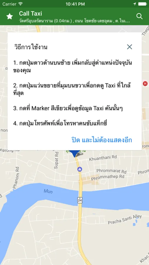 แอฟสำหรับเรียกแท็กซี่ภายในจังหวัดอุบลราชธานี มีความสามารถในการระบุตำแหน่ง แท็กซี่ภายในจังหวัด ที่ว่างพร้อมรับงานอยู่ สามารถคำนวนแท็กซี่คันที่ใกล้ที่สุด พร้อมบอกระยะเวลา และระยะทาง ที่จะมาหาคุณได้