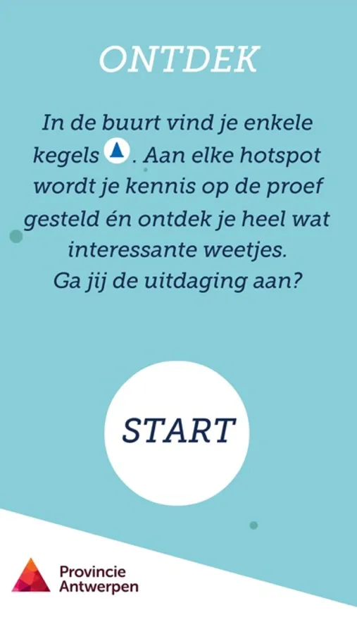 Deze app heb je nodig als je het kegel-parcours wil afleggen van de provincie Antwerpen. Download de app en ga dan op zoek naar de kegels. Aan elke kegel krijg je vervolgens op je smartphone hapklare informatie of ludieke vragen over het provinciale water-, natuur-, milieu- of klimaatbeleid.