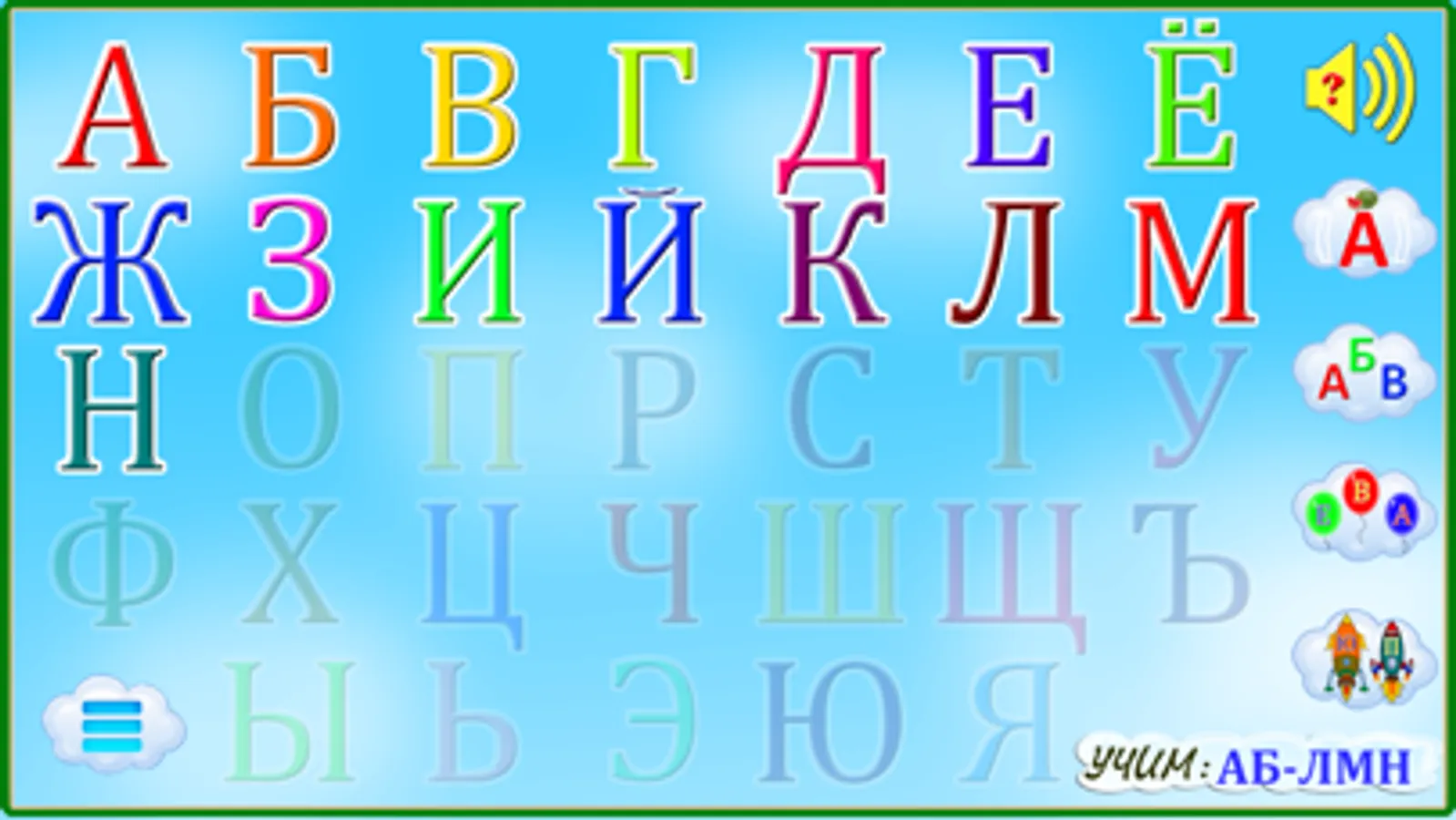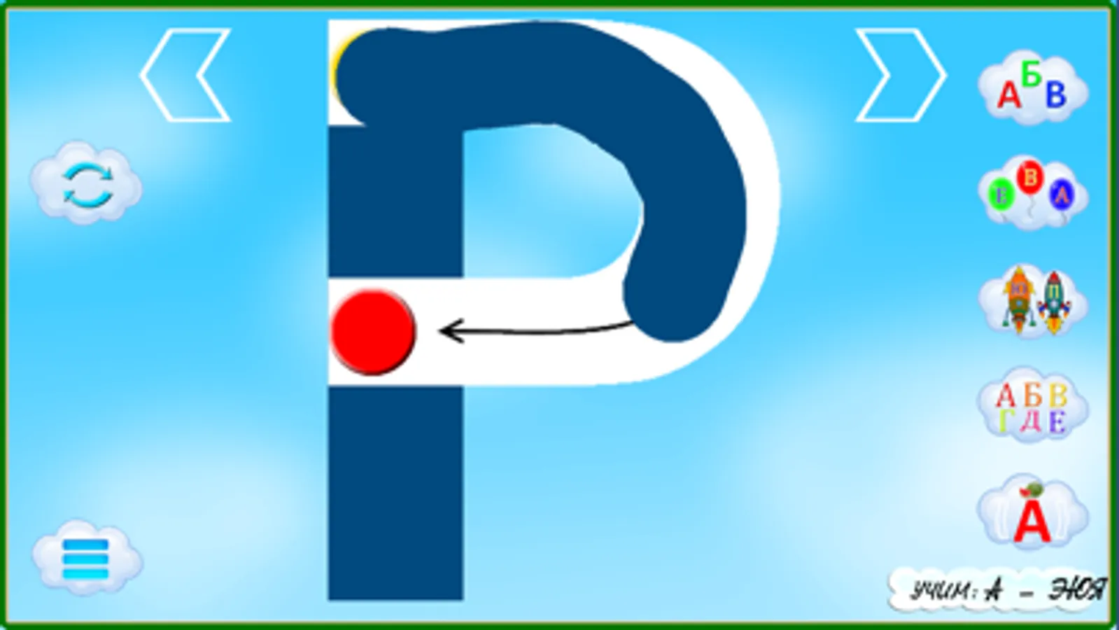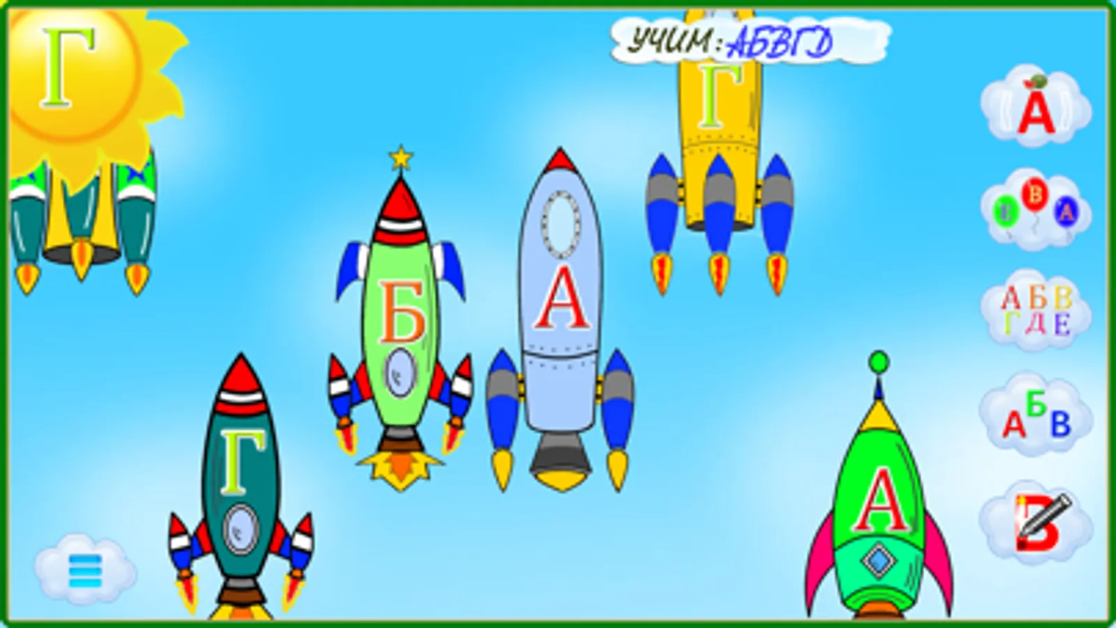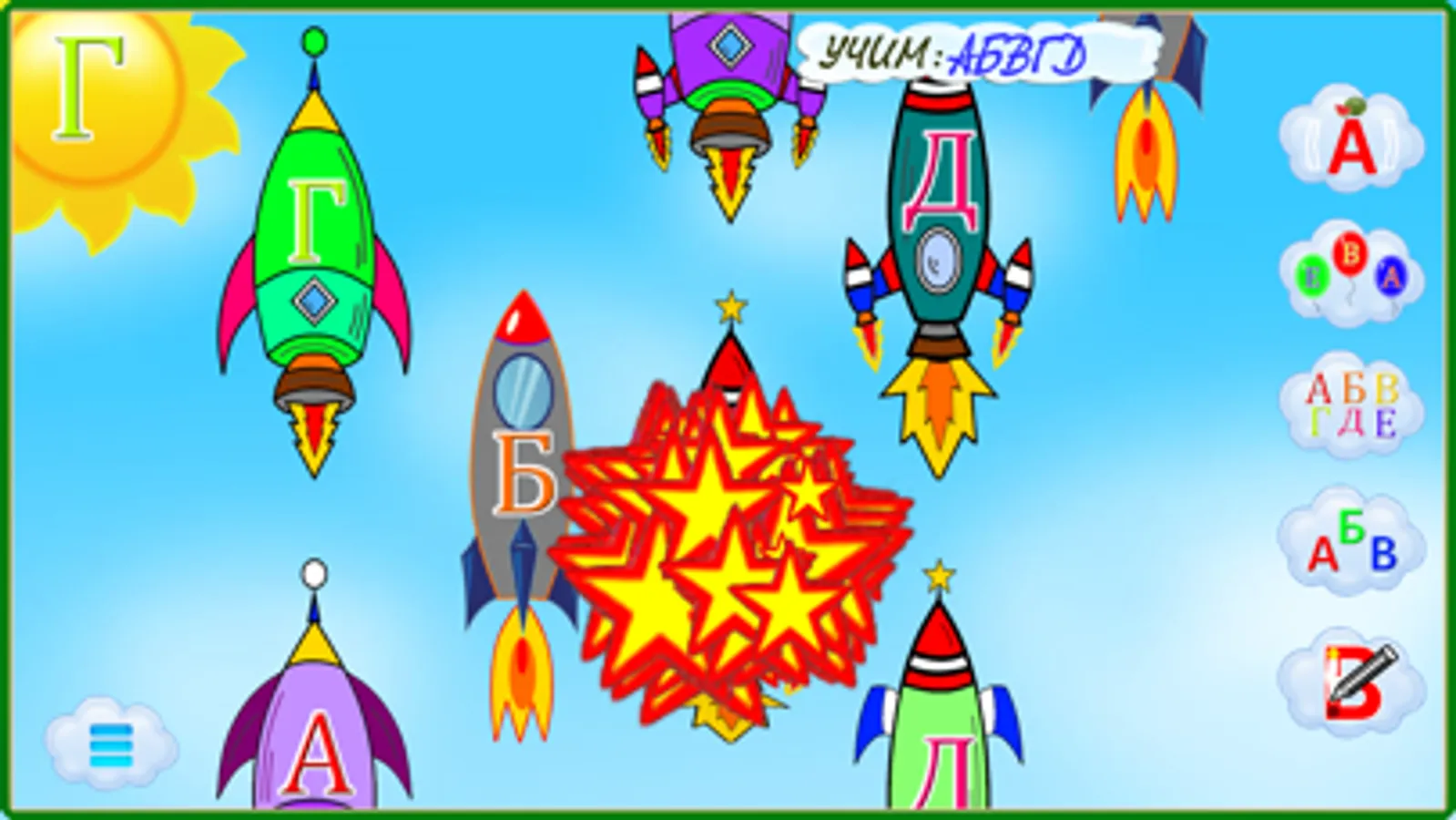 Эта игра также для закрепления изучаемых букв в игровой форме. Экран представляет собой небо куда поднимаются ракеты неся на себе буквы. Даётся задание - буква, которая произносится и пишется на солнышке. Буквы с ракетами летят постоянно вверх и малышу надо успеть найти на ракете требуемую букву и нажать на ракету.