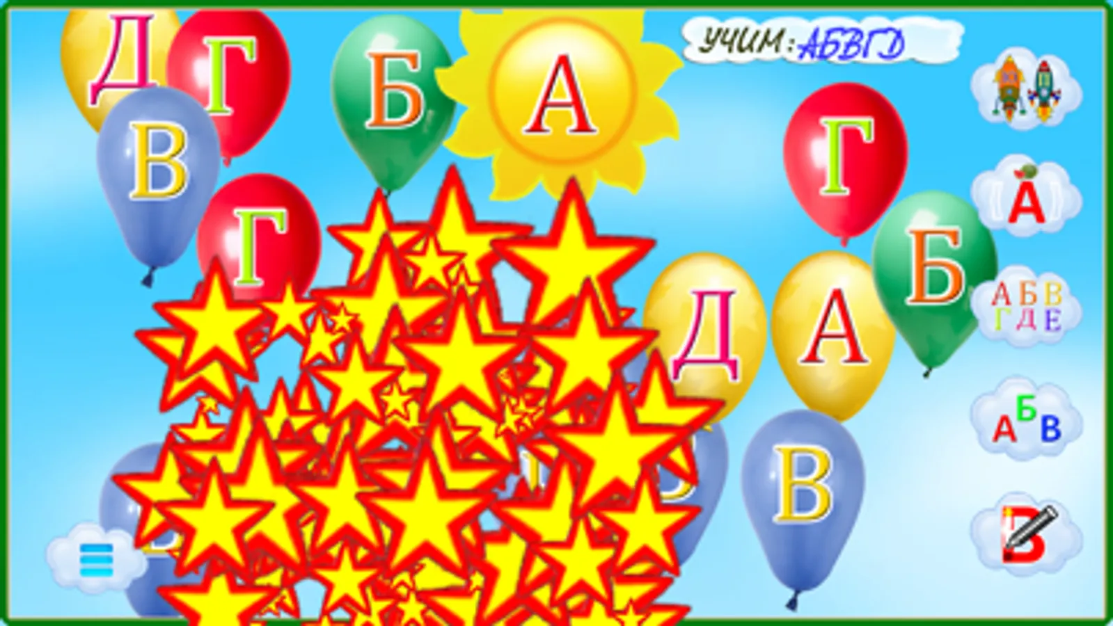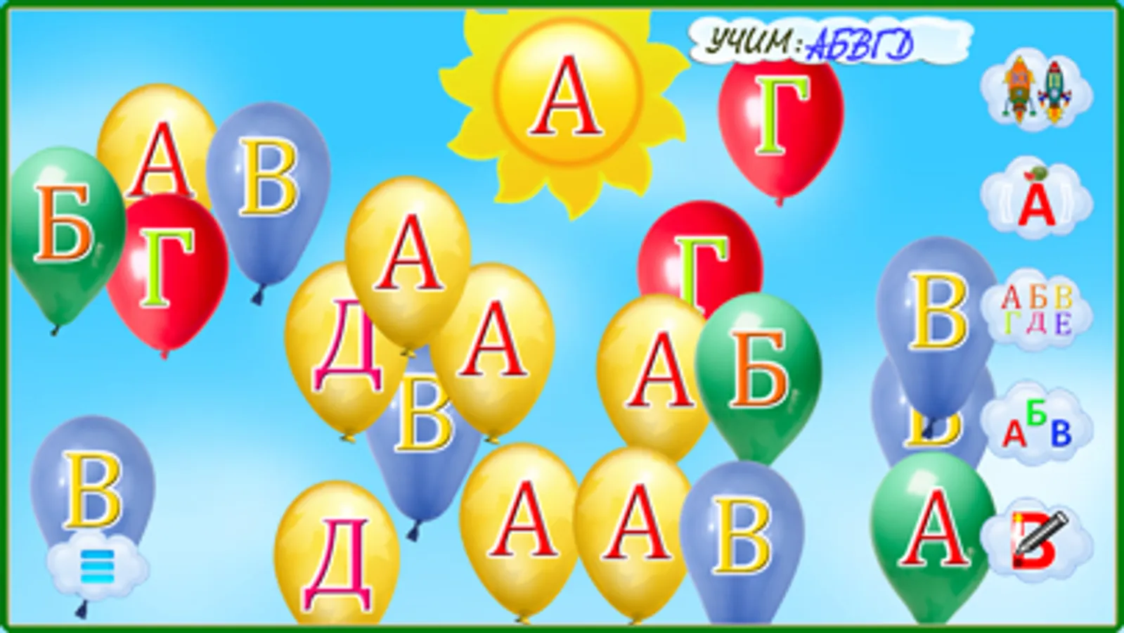 Эта игра для закрепления изучаемых букв в игровой форме. На экране появляются шарики с буквами и дается задание - буква, которая произносится и пишется посередине экрана на солнышке. Ребенку надо найти требуемую букву на шарике и нажать на неё, шарик лопнет. Задание считается выполненным после лопанья 7 шариков. После этого задания буква меняется, даются новые шарики с перемешанными буквами. Каждый раз буквы меняются случайным образом.